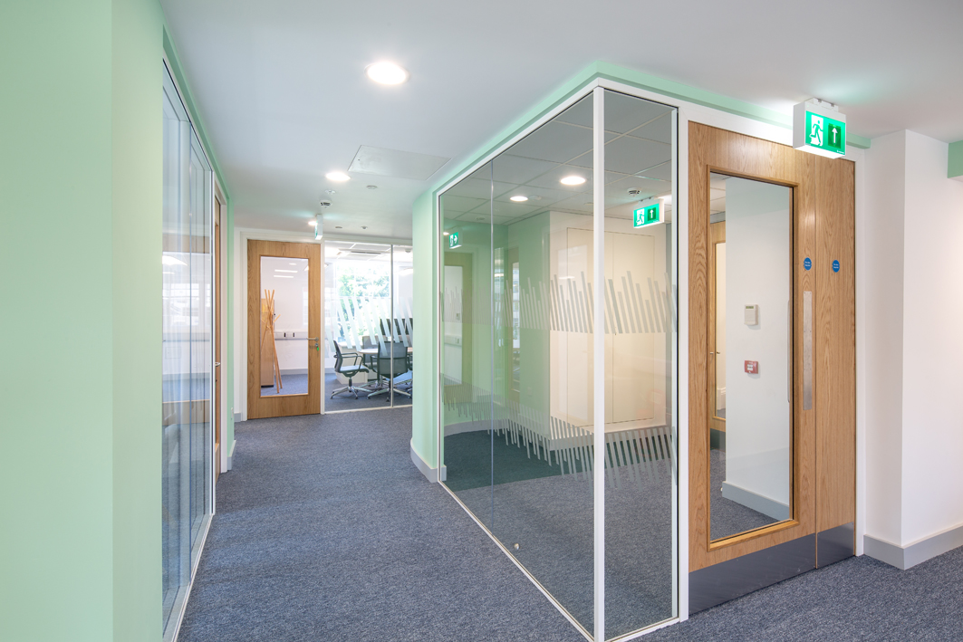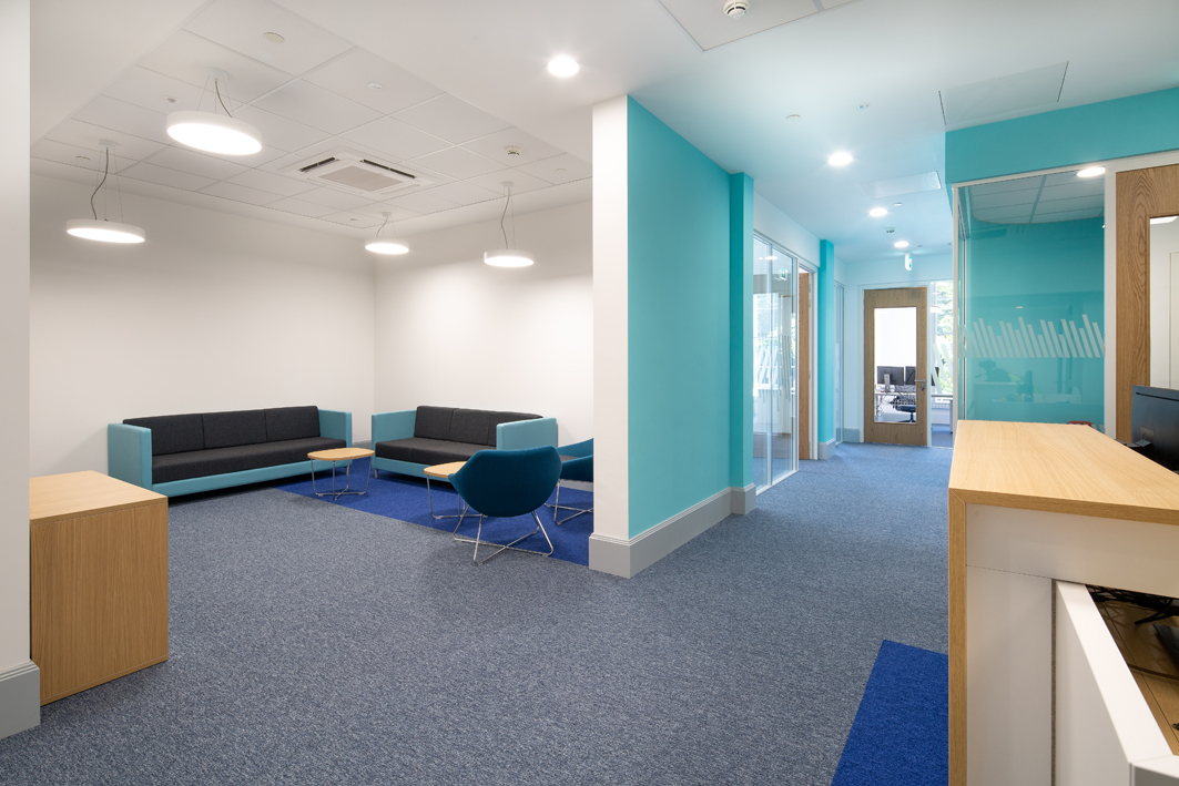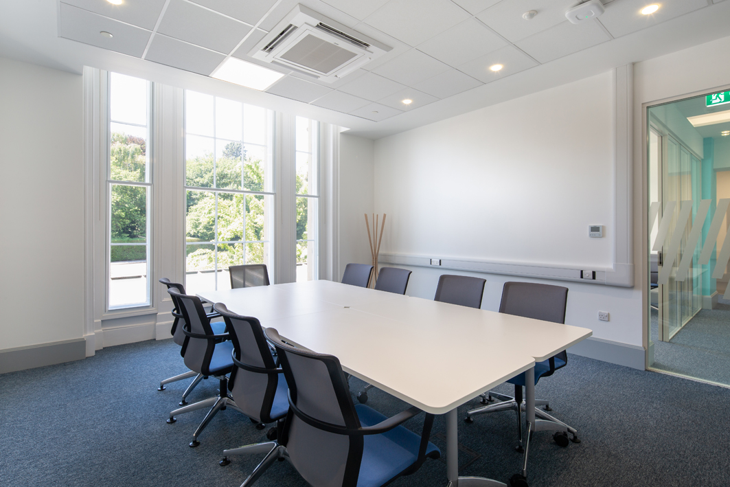 The works comprised the complete strip-out and refurbishment of Beacon House (1st–4th floors), including structural improvements, drainage upgrades, installation of new air conditioning systems, specialist acoustic treatments, roof and window repairs, as well as new internal finishes and furniture procurement.